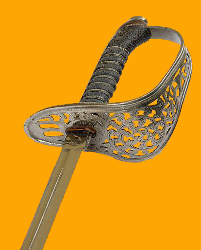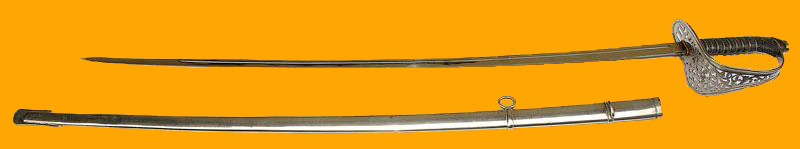 Traintruppen sysemisiert. Die Form des Korbes ist beim Offizierssäbel gleich dem Mannschaftssäbels. Statt der Bohrungen weist er gravierte, meistens florale Durchbrechungen auf. Es existieren unterschiedlichste Korb- und Klingenausführungen. |
