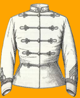 Offiziere und Fähnrich Auf der linken Achsel in der Ärmelnaht eine Achselschlinge aus doppelt gelegter goldener mit schwarzer Seide melierter Attilaschnur eingesetzt, welche 1,5 cm vom Kragenansatz angebrachten kleinen Knopf geknöpft wird, dieselbe ist mit einer aus gleicher Schnur erzeugten festgenähten Schleife versehen, um den Kartuschenriemen in einer bestimmten Lage zu erhalten. Die