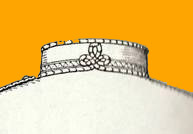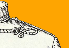 die Öhre aus Kupferdraht. Die Schnüre sind vierkantig, 5 mm breit durch sechs gelbe und zwei schwarze Fäden meliert, die Röschen kettelartig geflochten bilden ein schwarzes Feld mit einer grau-schwarz wechselten Einfassung. Anmerkung: Für